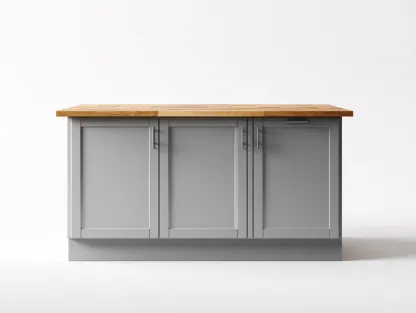 El mueble está fabricado con una estructura sólida y acabado en color gris combinado con una encimera en tono marrón que resalta el contraste de materiales. Las puertas presentan un diseño sencillo con tiradores metálicos que aportan una apariencia moderna y facilitan la apertura durante el uso diario.