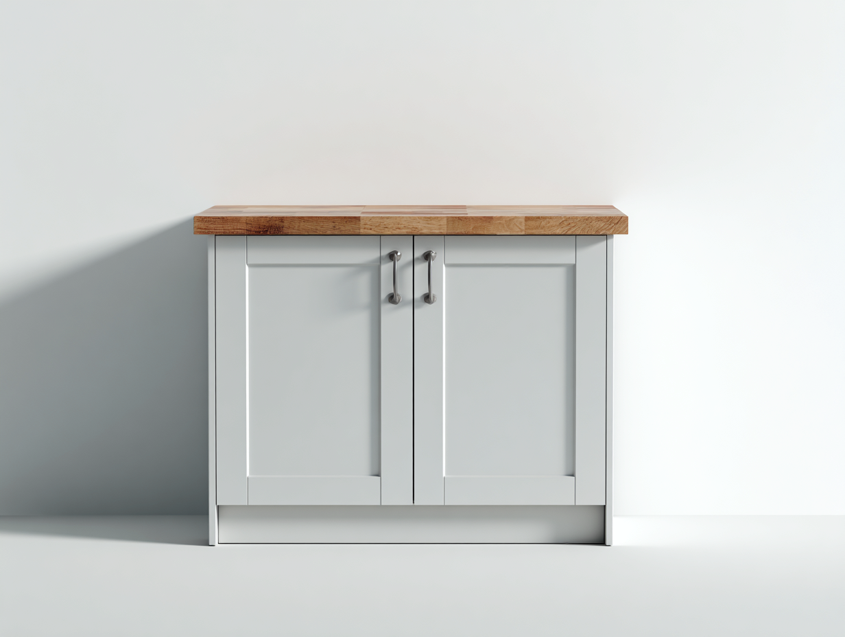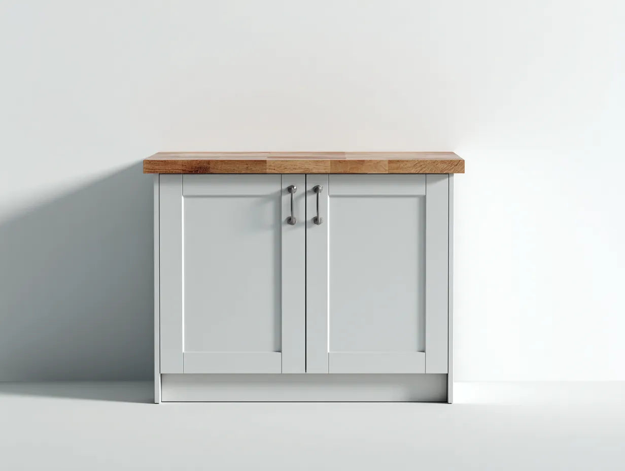 La estructura del mueble está fabricada en MDF resistente con acabado en color blanco. La superficie superior está realizada en madera maciza con acabado natural en tono marrón que resalta la textura del material. Los tiradores metálicos aportan durabilidad y facilitan el uso cotidiano del mueble.