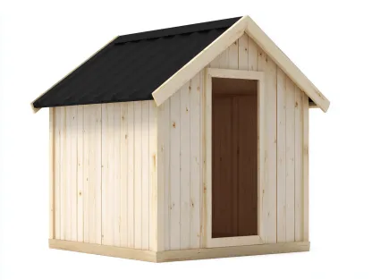 La estructura está fabricada en madera con acabado en tono natural que resalta la textura de la madera. El techo inclinado en color negro está diseñado para facilitar el drenaje del agua de lluvia y mejorar la protección frente a las condiciones climáticas exteriores.