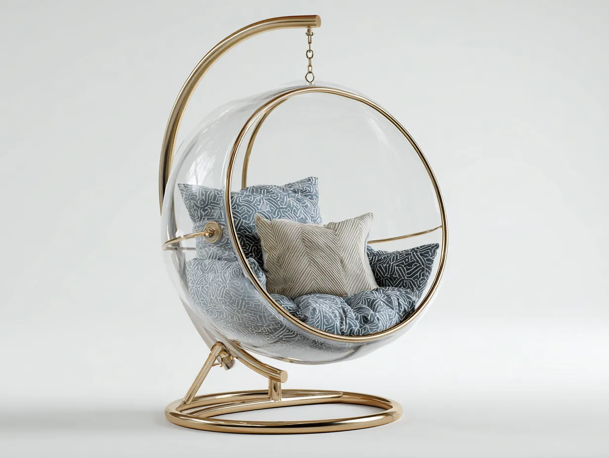 Este sillón colgante ofrece un espacio cómodo y elegante para relajarse en interiores. Su diseño moderno con estructura suspendida crea una sensación de ligereza visual y aporta un elemento decorativo sofisticado al ambiente de la sala de estar.